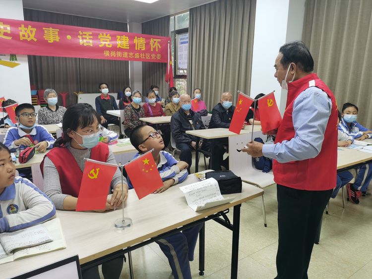 老年人协会党支部老党员黄华荣,以红色故事案例讲述党徽的来源,用深入浅出、朴实无华的语言,为辖区学生、党员、居民分享如何爱护党旗,及党徽、正确佩戴党员徽章。