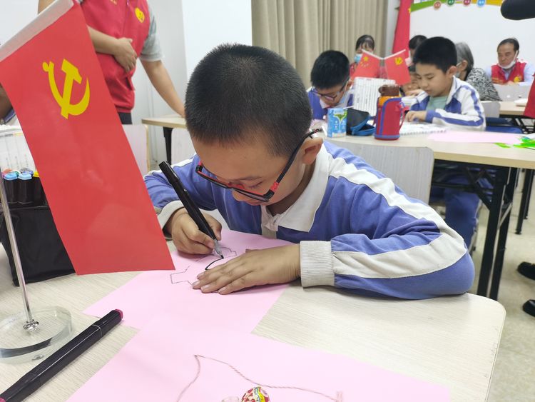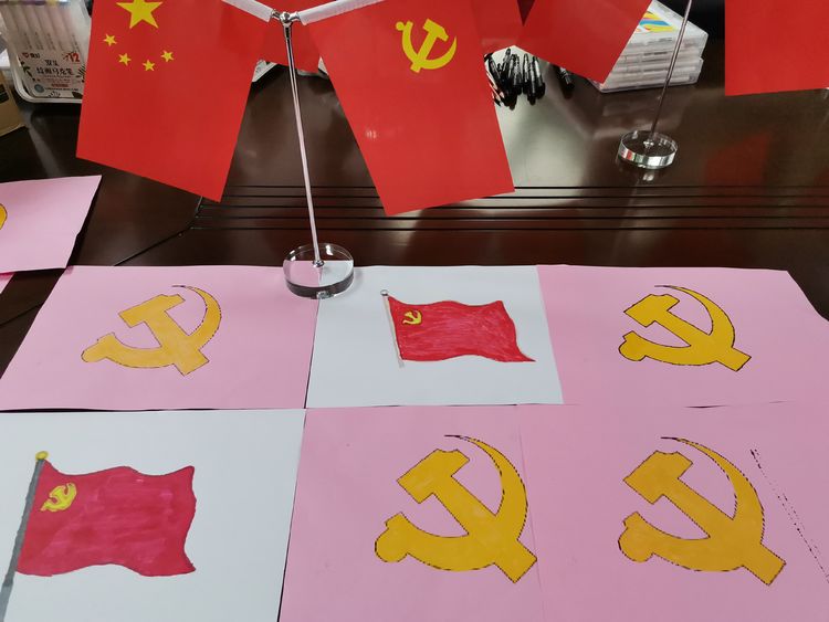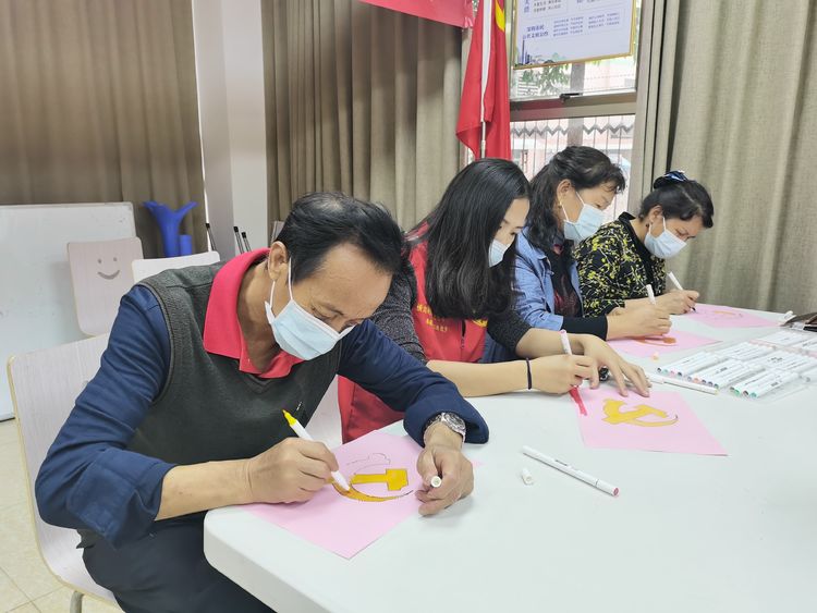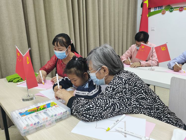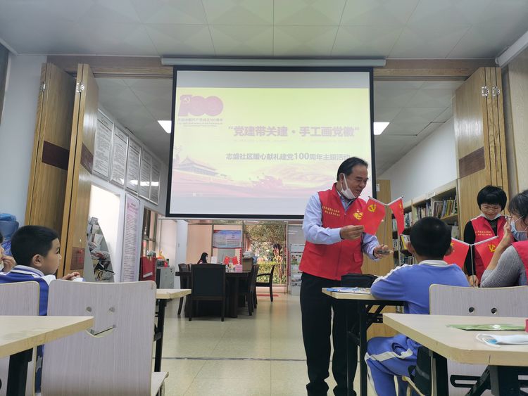现场有老、中、青三代、党员齐聚一堂,从学生到高龄党员,在志愿老师的带领下我们共画党徽,齐庆祝百年建党华诞,在志愿老师的教学与帮助下完成了党徽的绘制。