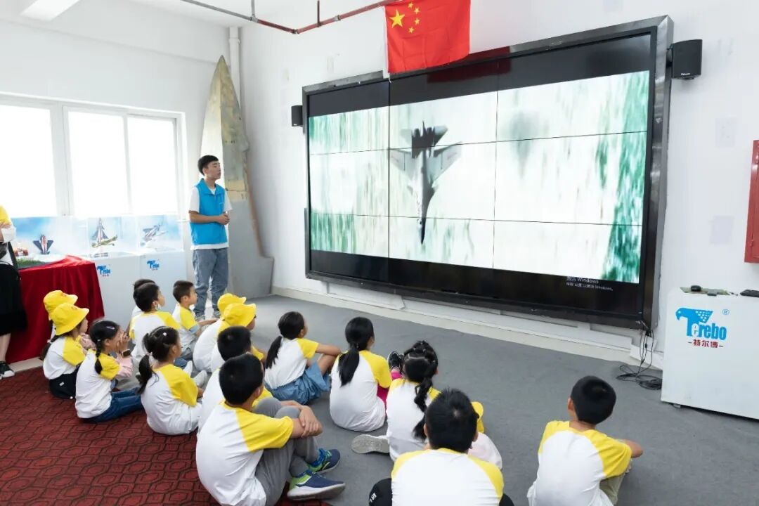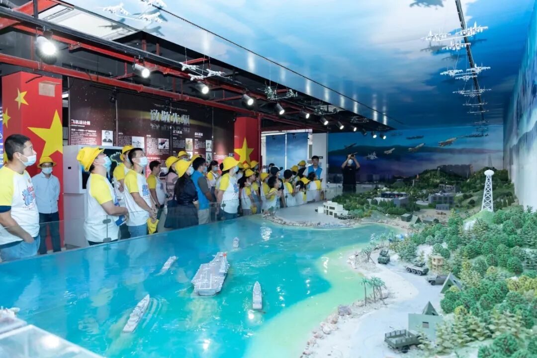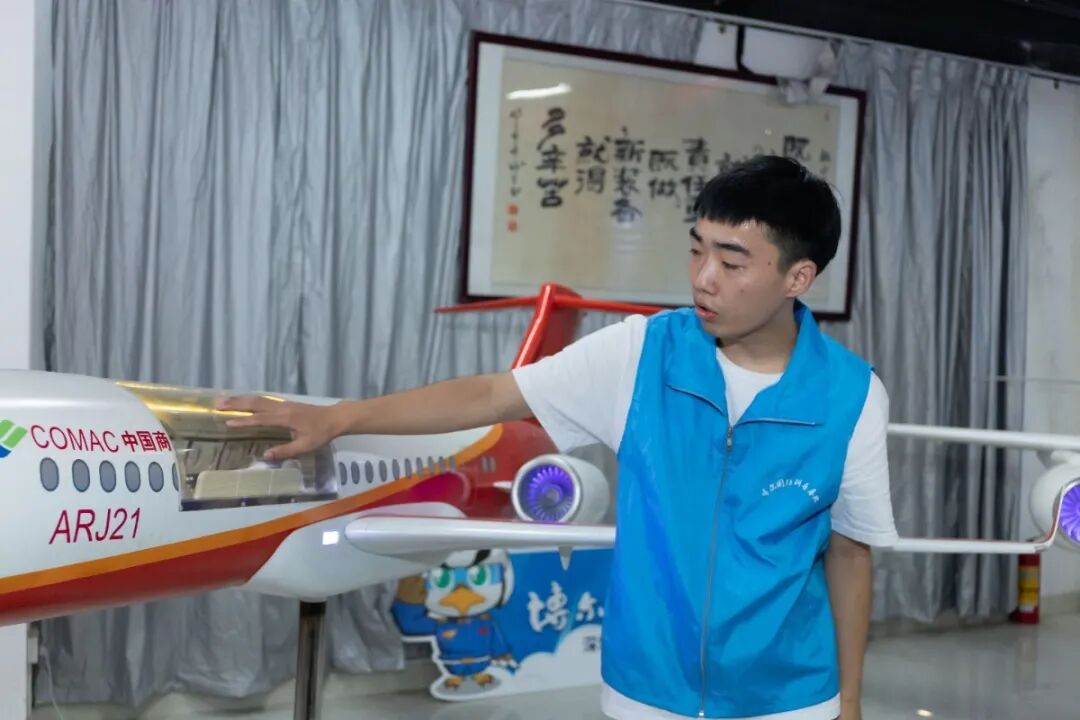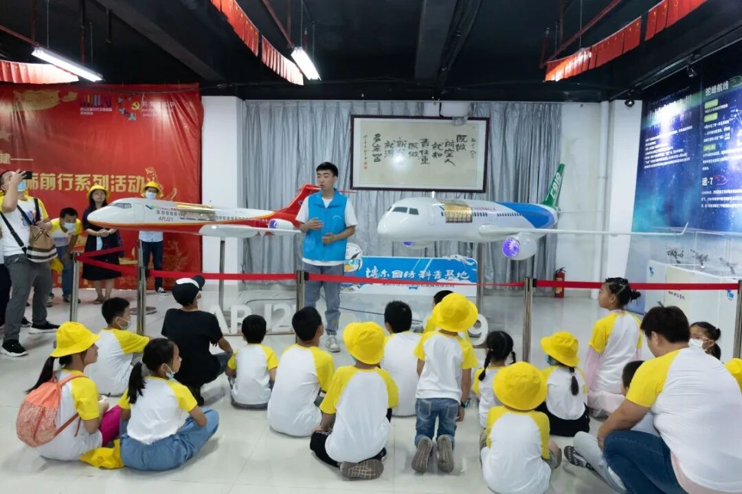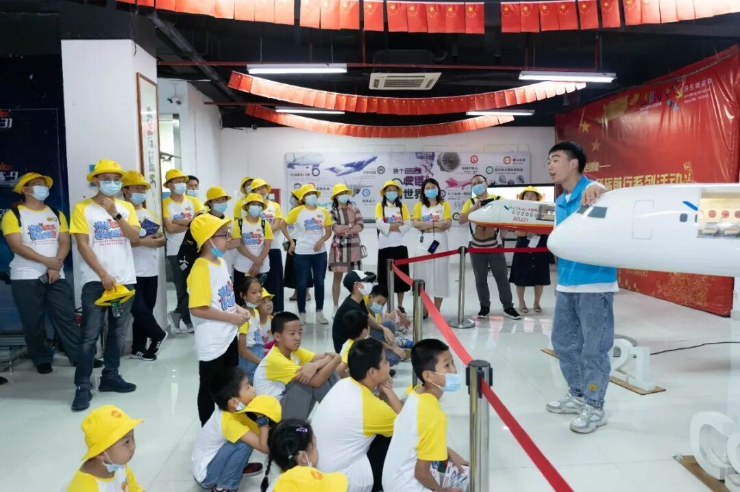 活动伊始,在专业老师的带领下,全体人员面对国旗宣誓,自强不息努力学习,为祖国的国防事业贡献自己应有的力量。在随后的展厅参观学习中,现场老师详细介绍了中国自主研发的国产商用支线飞机ARJ21和被誉为中国大飞机三剑客之一C919,生动形象的科普飞机结构知识,家长和孩子们细心思考、积极发言。