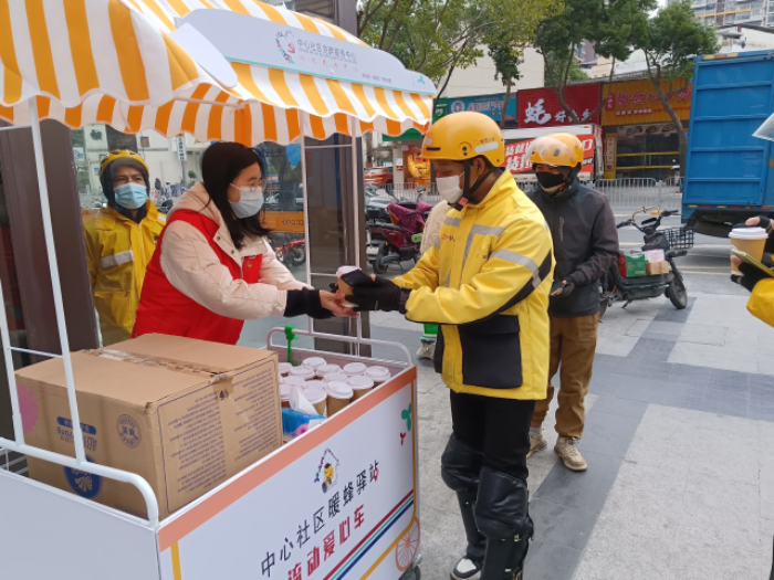 近日气温骤降,深圳龙岗区坪地街道中心社区的工作人员和志愿者,推着暖蜂驿站流动爱心车走街串巷,为户外奔走的外卖小哥、快递员送姜茶。随着一声声热情的问候,他们将这份温暖送到每一位“星骑士”手中。这份微不足道的关爱,成就了一场寒冬温情的送礼活动。
