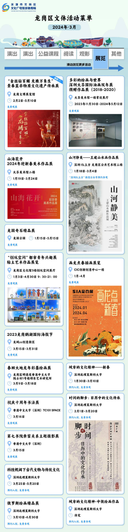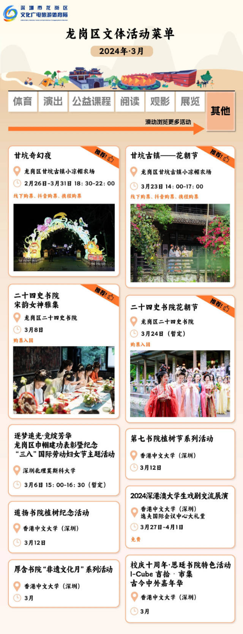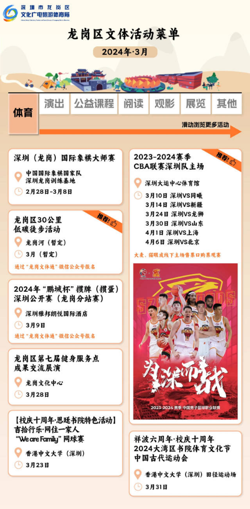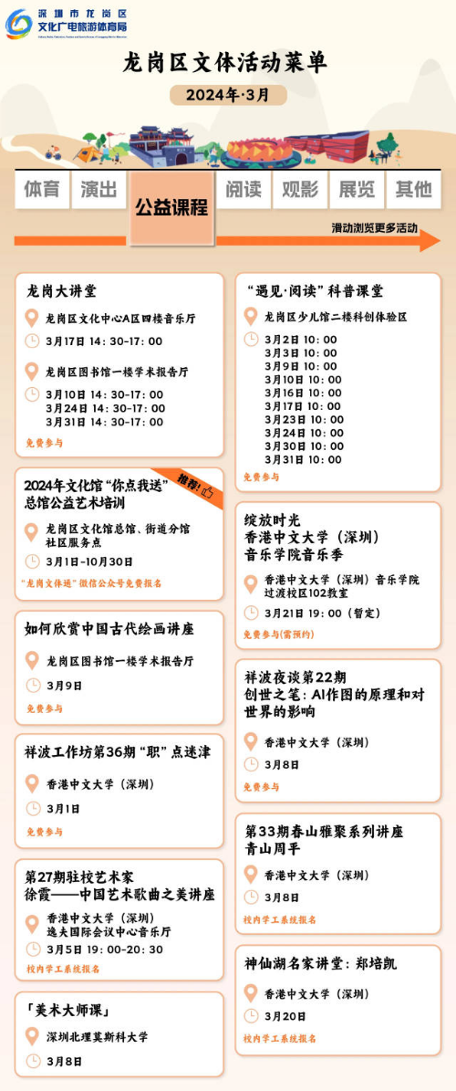 近期,深圳市龙岗区3月文体菜单出炉,包含体育、演出、公益课程、展览等五大类别。