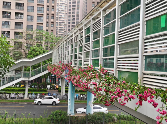 目前,四座天桥已全部完成改造,累计种植水红、橙色及黄色簕杜鹃约480米,绿化面积约320平方米,形成四条色彩丰富、特色鲜明的“空中花廊”,为城市道路沿线增色添彩。