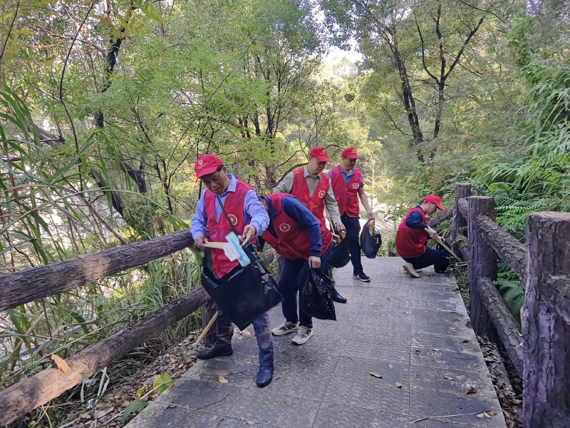 近日,在龙岗区宝龙街道振业天峦社区公园里一群红星志愿者手持垃圾钳和垃圾袋,沿着山道细致地清理着山体裸露着的垃圾,并向周边游客宣传守护绿水青山的环保理念,倡导大家将垃圾带走,不要随意丢弃,避免给景区的生态环境带来了严重的影响。
