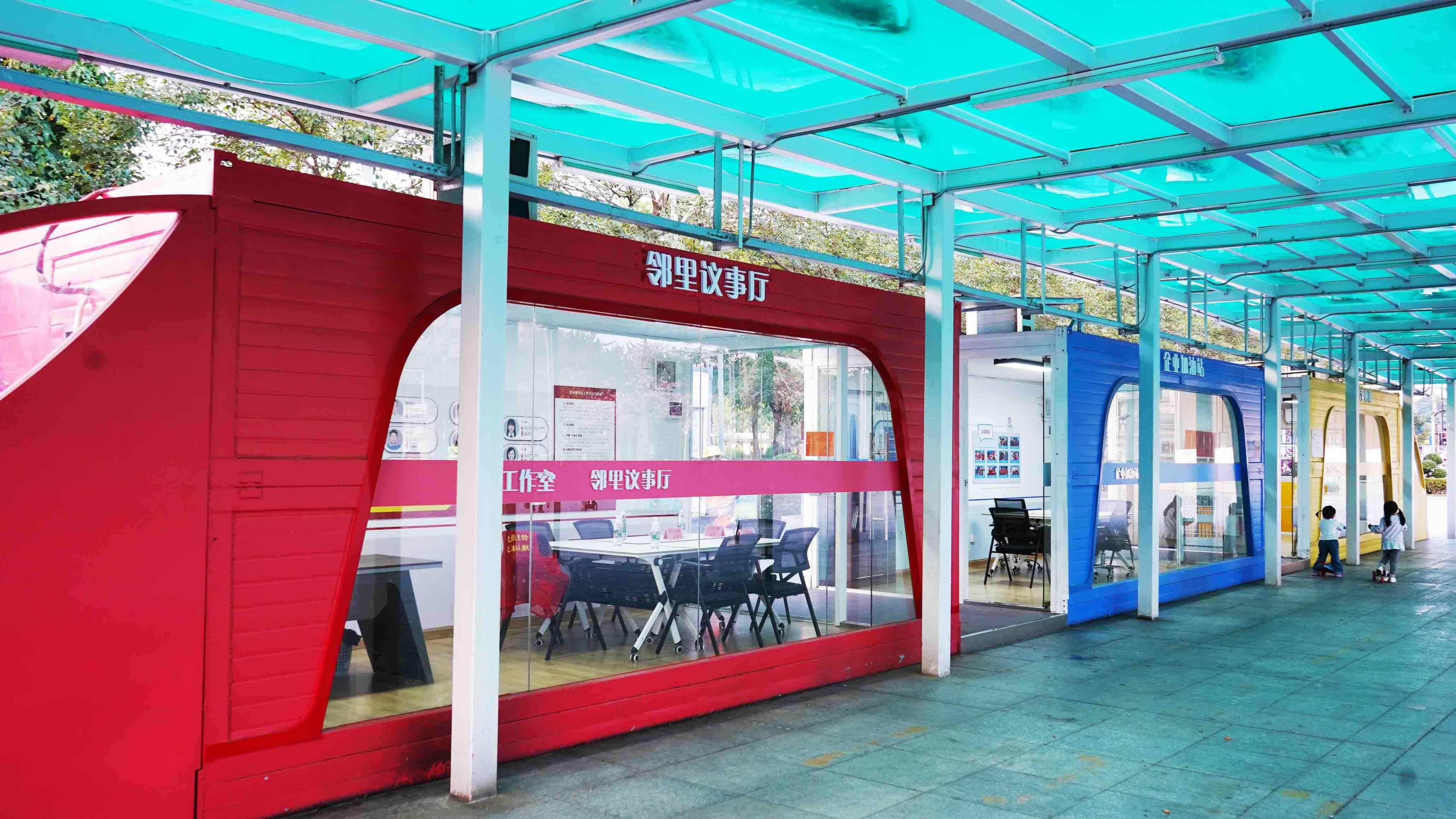 走进深圳市龙岗区宝龙街道同心社区的公园广场,一个设计得像在轨列车的钢架结构建筑特别引人注目。