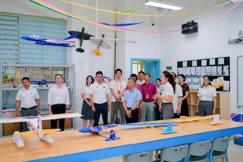 调研团一行参观航模室。据介绍,学校高度重视科学教育,注重创新创造意识的培养,结合深圳城市特点,从小就把科学的种子植入学生心中,成立了科创中心,配备机器人室、创客室、航模室等10个主题实验室,覆盖小初高全学段。学校还专门开设了创客课程,成立由专业教师组建的科技社团、机器人社团、小发明创造等学生社团。