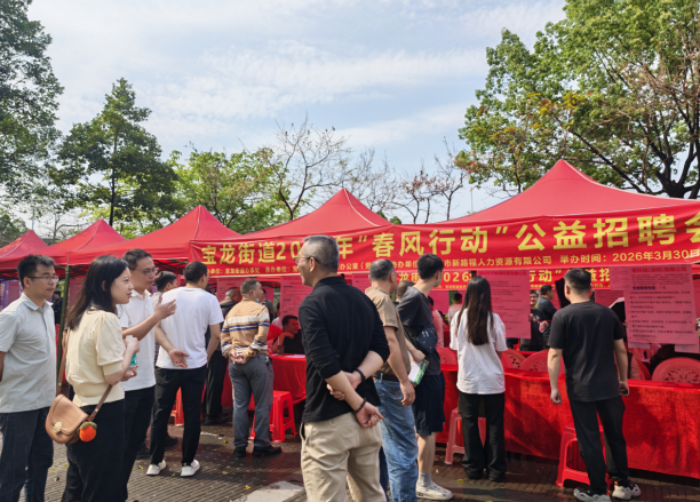 为全力稳就业、保用工、促发展,3月30日下午,龙岗区宝龙街道在尖莎咀购物中心广场举办2026年“春风行动”大型公益招聘会。抢抓春节后求职用工“黄金期”,搭建高效对接平台,助力辖区企业与求职者实现双向对接。