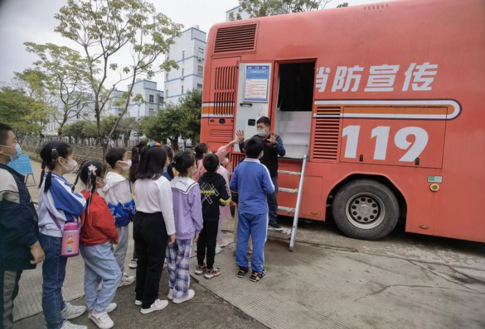 “有小朋友知道火场逃生时要注意什么吗?”“消防员叔叔我知道,火场逃生时要用湿毛巾掩着口鼻,然后低着身子……”现场,消防员与孩子们积极对话。接着,消防员带领孩子们近距离参观消防员常用的消防破拆器材、个人防护装备等,通过实物讲解引导青少年认识并正确使用、安装防毒面罩、烟感警报器、灭火器、消防警铃等这些平时甚少接触的消防器材,还让小朋友们穿上防护服,过了一把当消防员的“瘾”。
