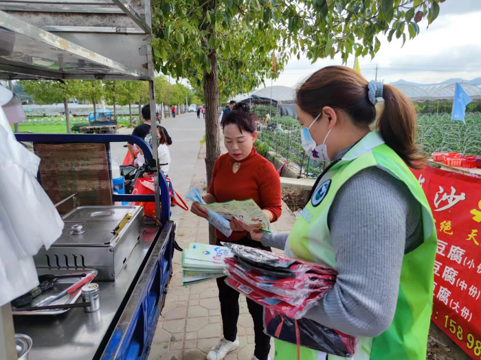 在田间,禁毒社工通过介绍仿真毒品、发放宣传折页等方式,向菜农们讲解罂粟和大麻等毒品原植物特征及危害,并介绍了非法种植毒品原植物所涉案的具体行政处罚或刑事处罚规定。