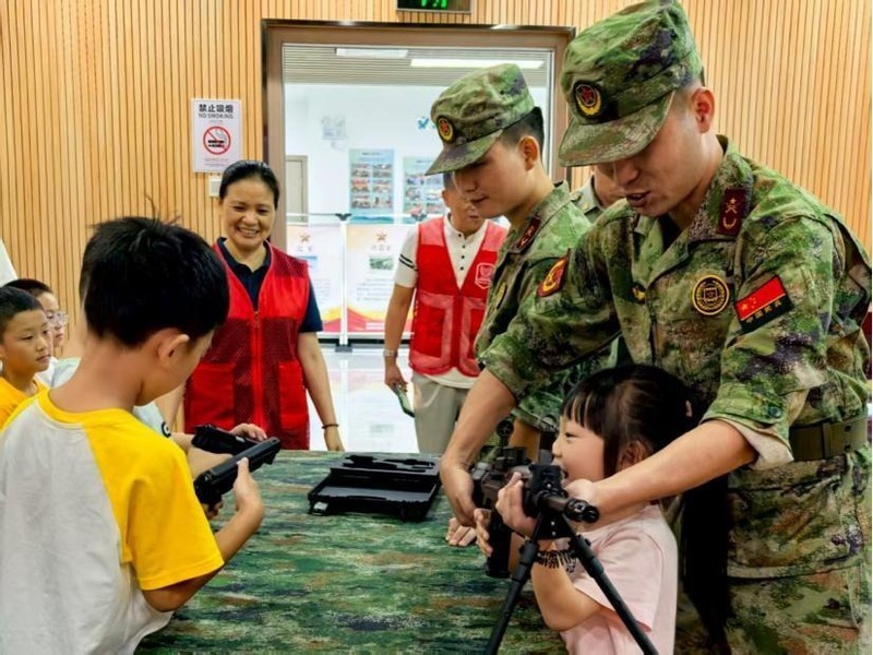 “小朋友们知道为什么要建设强大的国防吗?”退役军人讲师从我国的地图讲起,结合PPT和边防事迹,生动阐释国防的重要性。在国防保卫场景体验区,孩子们在匍匐前进赛道上弓着身子快速穿梭,在“飞夺泸定桥”和“运送弹药”模拟区体验互动。在军事装备体验区,退役军人耐心讲解操作技巧,孩子们细心观察手枪构造、体验瞄准动作要领等。