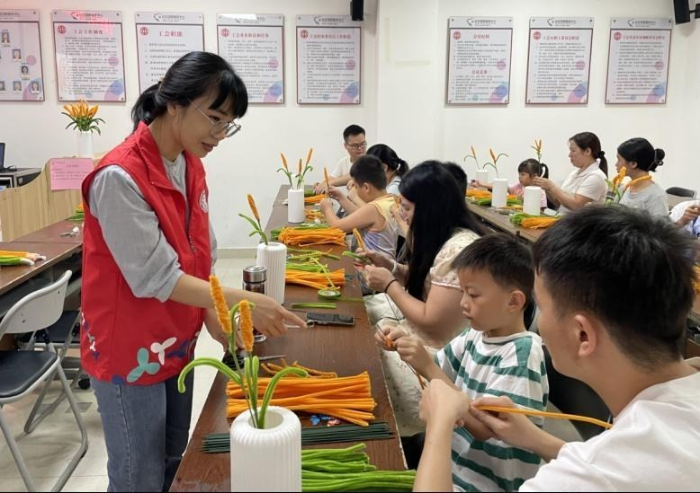 龙东社区则带领20名青少年开展“中国结”编织活动,通过讲解历史、亲手编制“三回盘长结”,让孩子们感受传统手工艺的魅力,增强文化自信。同德社区组织“金穗迎华诞”扭扭棒手工活动,亲子家庭共同制作金色麦穗手工作品,金色麦穗寓意丰收与国家安定,在创作中传递家国情怀。