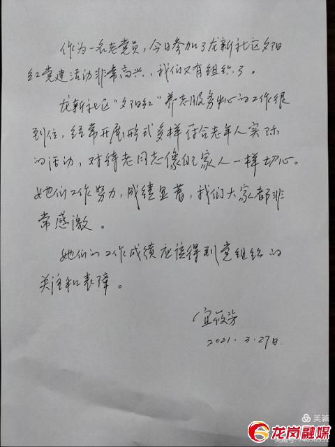“作为一名老党员,今日参加了龙新社区夕阳红党建活动非常高兴,我们又有组织了。”一位有50年党龄的阿姨现场写了一封表扬信,对龙新社区夕阳红开展党建系列活动,关心老党员为长者们的学习交流提供了良好的平台,给予高度的评价和认可。