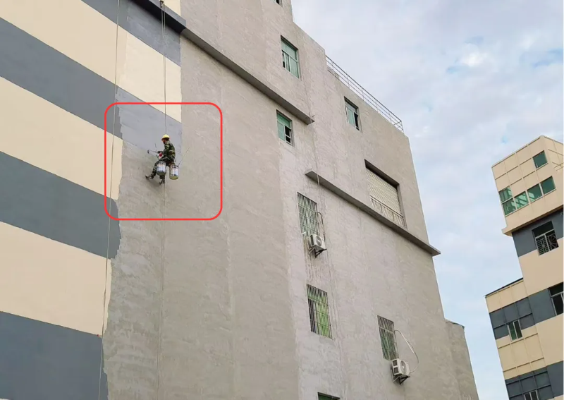 高处作业人员未佩戴安全带、使用单人单板吊具粉刷外墙。