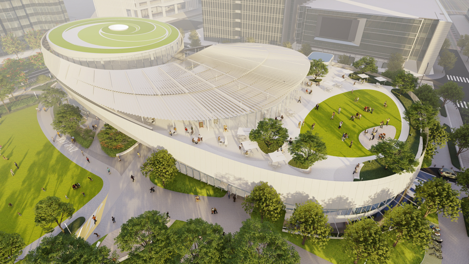 深晚记者了解到,展示服务中心坐落于公园大环境中,在设计理念中提取公园景观的环形元素,应用于建筑语汇中,将公园平面的环形丝带,转变为立体的丝带,利用平面和立体的丝带,将文化、体育、公园三种功能融合在一起,最终形成科技丝带的造型,将建筑与公园景观相互融合,建筑与公园形成一体化设计,建筑与公园形成一个“无限环”的概念。同时,结合本地气候,考虑到当地阳光强烈、高温多雨的亚热带季风气候。设计创造出标志性的遮阴顶盖,不仅遮阳挡雨,还能为城市塑造出特有的标志性,同时通过大面积的屋顶绿化,设计创造出标志性极强、生态节能的建筑第五立面。