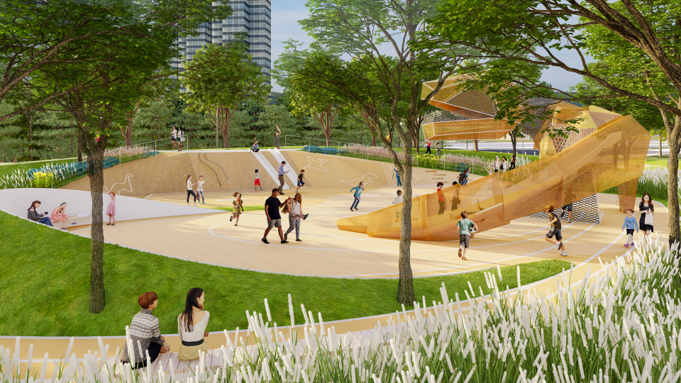 运动公园是街区智慧活力环中的中心公园,以科技发展循环、科创产业之环,以及科技、人、自然有机共生的生活环为理念核心,集合场地产业特色(Industry)、创新科技(Innovation)、投资发展(Investment),构建街区科创客厅、打造“科技之环”的地标形象,使运动公园成为活力动感、互动参与、开放包容的社区中央绿地。场地内以智慧跑道串联一系列互动景观,光环音乐旱喷广场、凤凰花下的科技展廊、流动的街边客厅、地形起伏的活力花园和毗邻建筑的商业庭院成为场地的外环空间,公园中央为可布置艺术展示、企业活动、市民休闲等多种功能的阳光草坪,以及结合场地地形变化,布置的林下剧场与林荫庭院空间,使公园兼具实际使用的功能与艺术化的设计感,成为街区内具有标志性的“科技之环”。