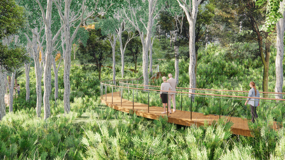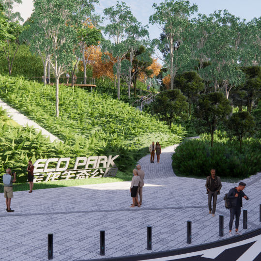 生态公园以打造街区郊野公园、延续自然山林生态为原则,打造自然生态与城市友好的山林公园。设计深入挖掘场地潜质,结合现有的坡地地形变化、山林自然条件,充分保留原有自然资源特色,在局部进行改造提升,置入科普教育、趣味探索、健康运动等功能性互动空间,形成区域吸引力,营造充满自然与艺术的生态公园。