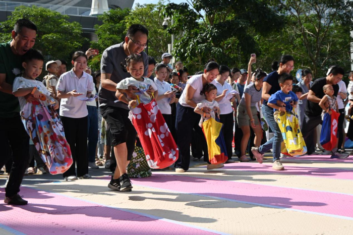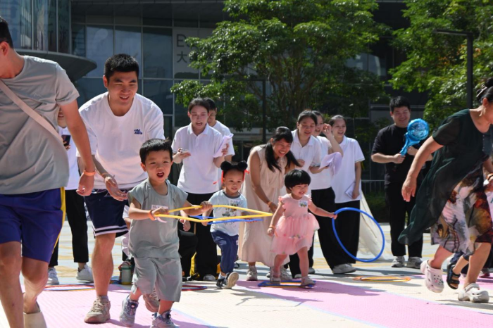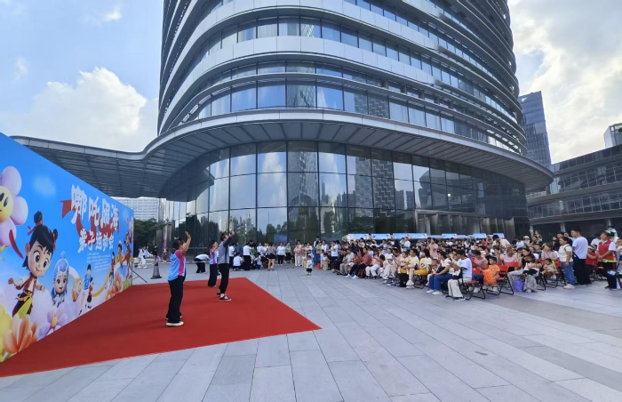 开场的表演点燃全场。托育机构的老师们率先登场,头戴俏皮的哪吒头饰,脸上挤眼、咧嘴的夸张表情灵动又鲜活,逗得在场家长和孩子们忍俊不禁。全场掌声与笑声此起彼伏,热闹非凡。伴着《草裙舞》的欢快节奏,孩子们迈着蹦跳且带点憨态的俏皮舞步,那认真又可爱的模样,使得台下家长纷纷举起手机拍照记录。亲子走秀环节紧随其后,多组家庭轮番登场,有的家庭穿着亲子装,有的家庭即兴摆出创意造型,现场满是温馨与幸福。“平时工作忙,很少有机会陪伴孩子,今天来到星河双子塔打卡并参加亲子活动,这样的活动很有意义”家长王先生脸上满是笑意地说。