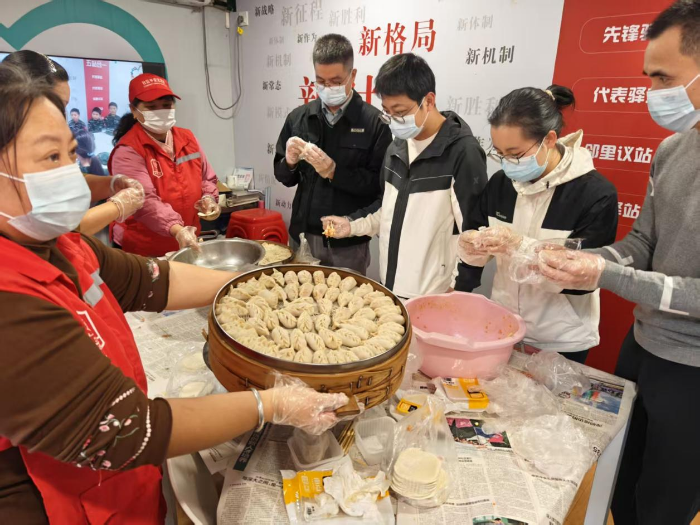 和面、擀皮、调馅、包捏……长桌旁,几十双手忙碌不停,动作娴熟,配合默契。在众多熟悉的“红马甲”志愿者中,来自珠江村镇银行的年轻人也沉浸其中,他们今天的角色并非金融顾问,而是学徒和帮手。“阿姨,这个褶子怎么捏才漂亮?”一位年轻的银行员工虚心地向身边的志愿者陈阿姨请教。从处理财务报表到拿捏饺子褶,角色的转换带来奇妙的化学反应。擀面杖起落间、指尖翻飞中,在社区党委的搭台下,企业从“出资”到“出手”的深度参与,与志愿者的奉献精神相互交融,让“扬善扬美”的风尚在互动中愈发浓郁。