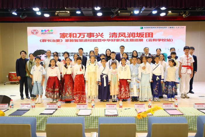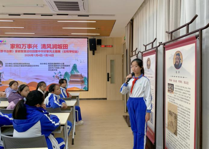为深入弘扬中华优秀传统文化,传承优良家风,健全校家社协同育人机制,1月6日下午,坂田街道“家和万事兴 清风润坂田”中华好家风主题巡展活动在龙外(集团)云和学校成功举办。这场持续深化的家风传承之旅,续写了惠泽校园的新篇章,进一步延展了协同育人的覆盖面与影响力。坂田街道党工委委员、妇联主席余秋婵,深圳市六和园工作室负责人方伟坤,街道妇联、团工委、新时代文明实践所、坂田教育办及辖区部分学校校长、幼儿园园长代表与全校师生、家长代表等200余人共同见证了这一传承文化、涵养家风的育人盛事。