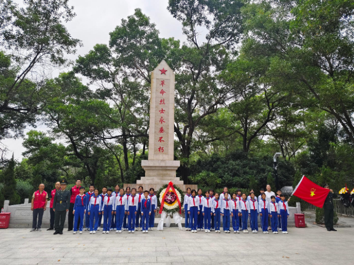 纪念碑巍然矗立,碑身“革命烈士永垂不朽”八个大字在苍松翠柏的映衬下熠熠生辉。民兵队伍身着制服列队肃立,退役军人志愿者与师生共同向烈士敬献花圈,默哀致敬。花圈缎带上“缅怀先烈志,共铸中华魂”的字样,寄托着对英烈的无限追思。民兵与退役军人以整齐的队列,展现了“退役不褪色、转业不转志”的优良风貌。