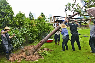 为保证城区整洁有序,龙岗区城管局迅速组织人员、车辆于昨日凌晨5点开始进行清理。该局及各街道城管部门应急抢险队全部出动开展巡查及应急抢险工作,共出动人员1165人次,车辆138辆次,机械台班15班,及时对倾斜、倒伏的树木进行扶正、清理,对破损的路灯、广告牌进行修复等。