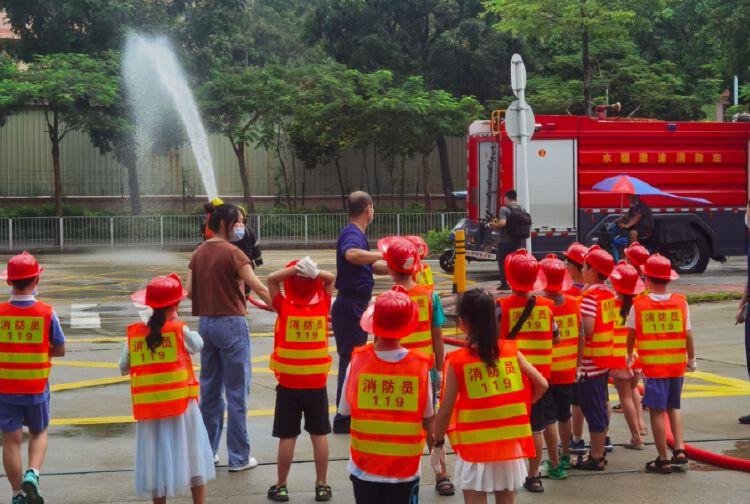 最后消防员向孩子们展示高处灭火,针对不同火情采取直线喷射或是花式喷射。让孩子们现场更真实地感受火情扑灭和救援场景。