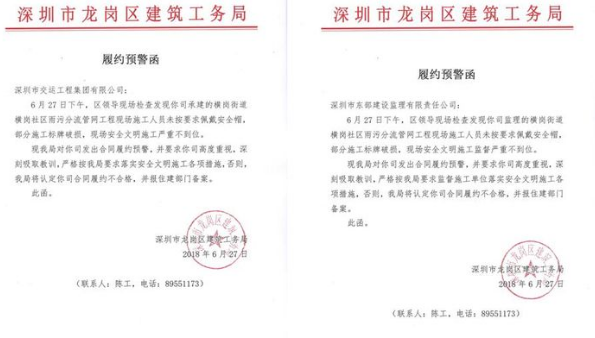 区建筑工务局始终坚持对雨污分流管网工程严管严罚,据统计,已2次对横岗社区、六约片区雨污分流管网工程的施工、监理单位下达合同履约预警函,3次责令停工整改,下发合同违约通知书11份,对施工单位(深圳市交运工程集团有限公司)处以合同违约金9.6万元,对监理单位(深圳市东部建设监理有限责任公司)处以合同违约金0.6万元。