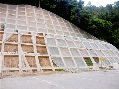 记者发现,该处边坡已修建了崭新的框架形式钢筋混凝土格构梁及排水设施。施工单位工作人员告诉记者,完成绿化养护后,该边坡将彻底完工。