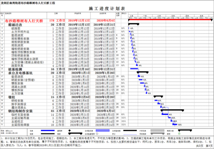 目前,布沙路人行天桥工程已经完成电力及通信管线迁改、桩基础施工、主桥箱梁预制等工作,正在进行桩基础完整性检测,总形象进度约60%。预计于2020年2月份完成承台及墩柱施工,3月份进行主桥吊装工作,4月份完成雨棚安装及桥面附属工作,5月份完成电梯安装及调试工作并正式开通使用。