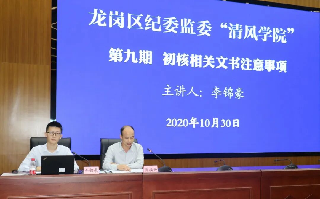 10月30日,龙岗区纪委监委第九期“清风学院”培训举行。本期主讲人是来自第七纪检监察室的年轻纪检监察干部李锦豪。委领导班子成员,委纪检监察干部及各街道纪工委工作人员参加了培训会。下面,就让清风君带你直击“清风学院”培训现场,快来瞧一瞧!