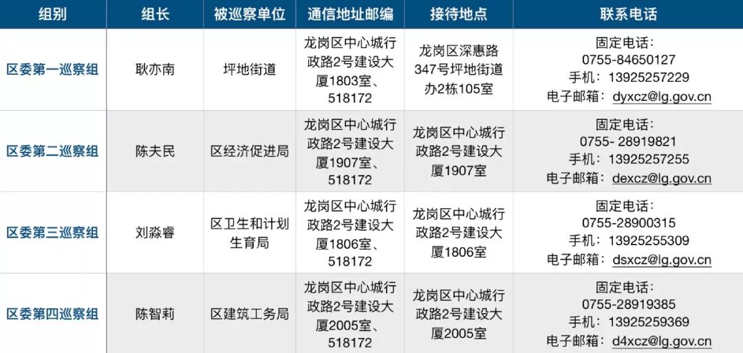 9月10日龙岗区启动了六届区委第四轮巡察本轮巡察设立四个巡察组,分别巡察:区卫生和计划生育局党组、区经济促进局党组、区建筑工务局党组、坪地街道党工委。9月17日-18日,四个巡察组已全部进驻被巡察单位,并召开动员会。