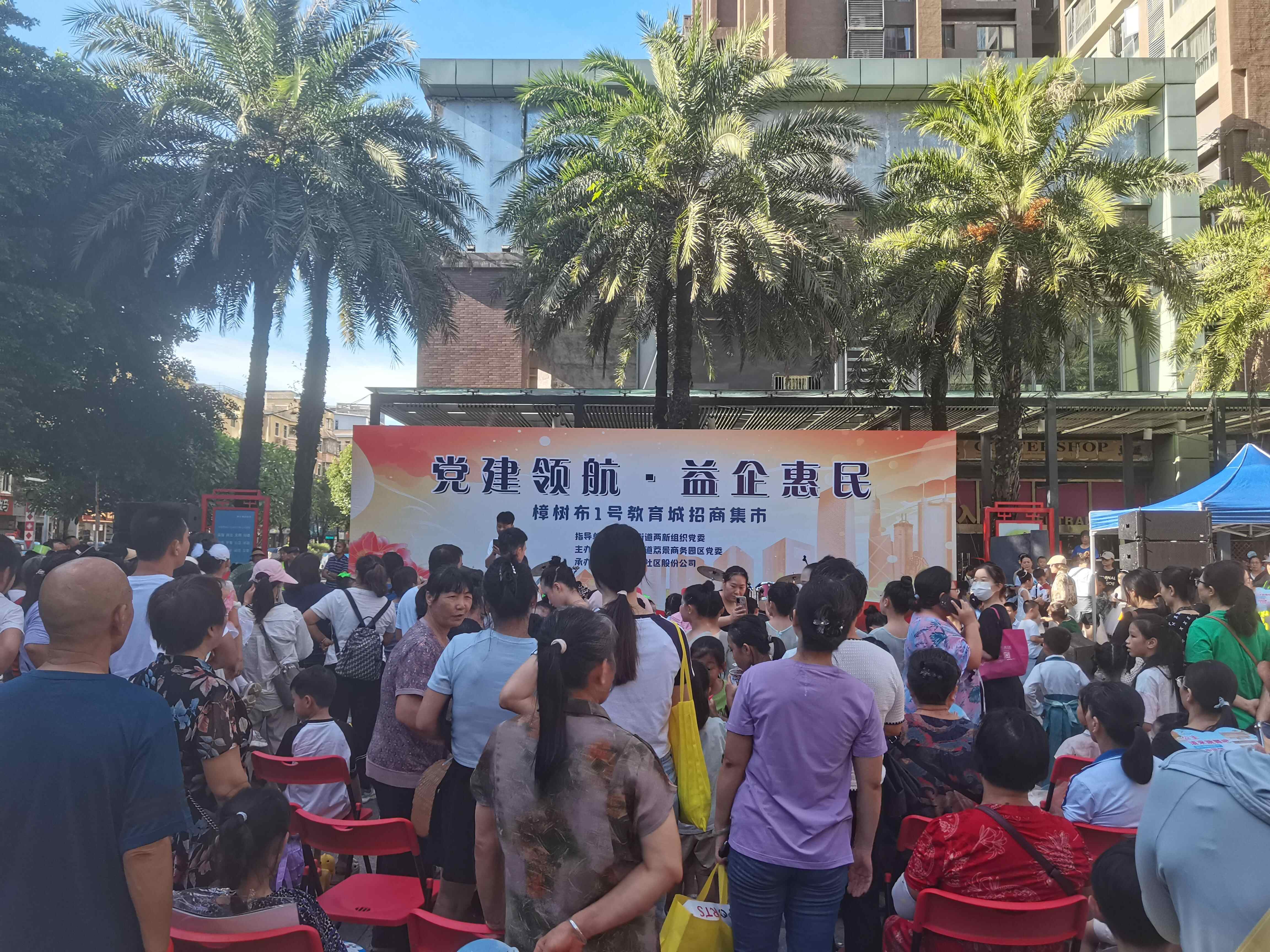 7月6日,由深圳市龙岗区南湾街道“两新”党委指导,南湾街道荔景商务园区党委、樟树布社区股份公司主办的“党建领航·益企惠民”——樟树布1号教育城招商集市,在孩子们欢快的歌舞声中火热开幕。
