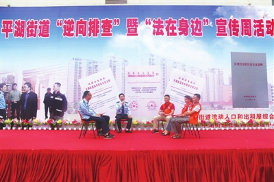 5月18日,平湖街道网格管理“逆向”排查暨“法在身边”宣传周活动在平湖社区熙璟城小区广场举行。龙岗区综管办、网格办、街道维稳及综治办、安监办、流动人口和出租屋综管所、社区网格管理中心、各社区工作站等单位负责人以及楼栋长、网格员代表共326人参加活动。