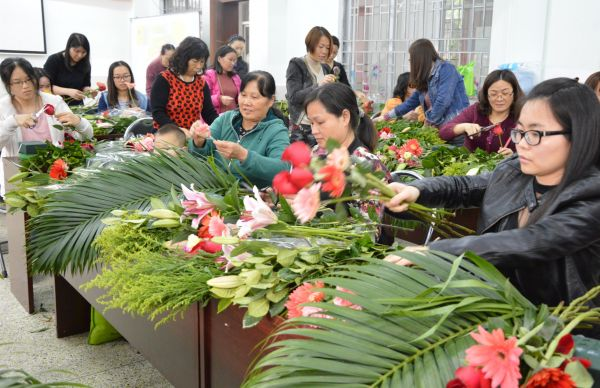 多媒体教室里,老师细心地摆放好插花的素料。此时,参与活动的女士们都被花香吸引了过来,看着玫瑰花、康乃馨、太阳花等各色花儿唯美绽放,大伙迫不及待地说“老师,我们快点上课吧!”课堂上,老师边耐心讲解边进行现场示范指导,不时走到台下为学员们作指引修正。大家捧着亲手制作的花艺都不禁拿出手机拍照。