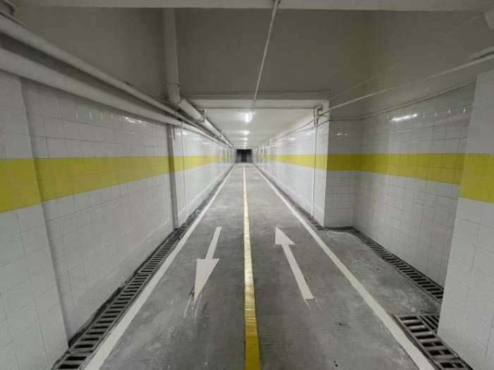 经过约一个月的紧张施工,曾经“墙面发霉、瓷砖破损、灯光昏暗”的地下通道彻底焕新:坡道从33度优化至22度,彻底杜绝溜车风险;清晰划分非机动车道,破解人车混行难题;墙面顶棚全面翻新,新光源点亮通行空间,即便夜间通行,市民也能感受到满满安全感,高峰时段拥堵现象也显著缓解。