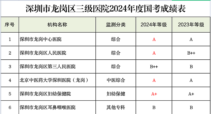 其中,亮点纷呈、突破显著:龙岗中心医院CMI值(病例组合指数,核心反映医院收治患者疾病疑难程度)首次突破1,标志着该院重症患者救治能力、疑难病症诊疗水平实现质的飞跃;龙岗区人民医院首次跻身A级行列,打破历史纪录,实现该院“国考”成绩的历史性突破;龙岗区第三人民医院实现两个等级的跨越式提升,发展势头迅猛;其余3家医院也持续稳固在优秀水平,形成“整体提升、亮点凸显”的良好发展格局。