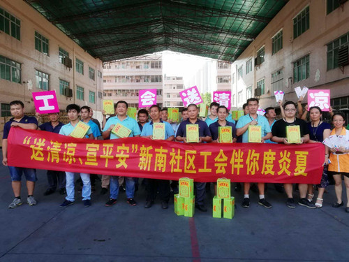 近日,新南社区工会在辖区企业深圳市伟利丰塑胶制品有限公司开展“‘送清凉,促平安’新南社区工会伴你度炎夏”活动,为伟利丰一线职工送去清凉饮料100箱,同时派发反诈骗、交通安全、扫黑除恶等宣传小册子200余份,为职工在炎炎夏日里送去清凉及平安。
