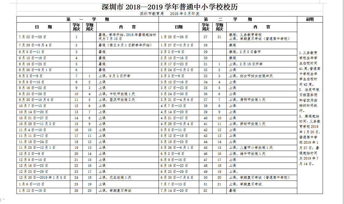 根据《广东省教育厅关于制定2018-2019学年普通中小学校校历的通知》(粤教基函〔2018〕101号)的有关精神,我局制定了《深圳市2018-2019学年普通中小学校校历》(附件)。现将有关事项通知如下: