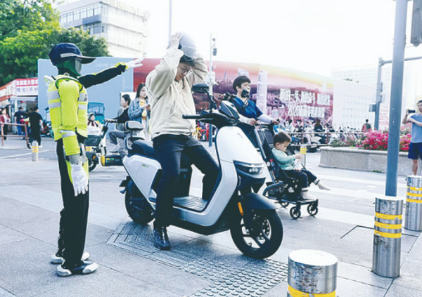 Equipped with visual AI recognition technology, the robot monitors traffic flow at the Wuhe Avenue and Meiban Avenue crossing. When it detects e-bike riders without helmets or vehicles stopping beyond the white line, it issues a warning whistle and delivers instant persuasion through gestures and voice prompts.