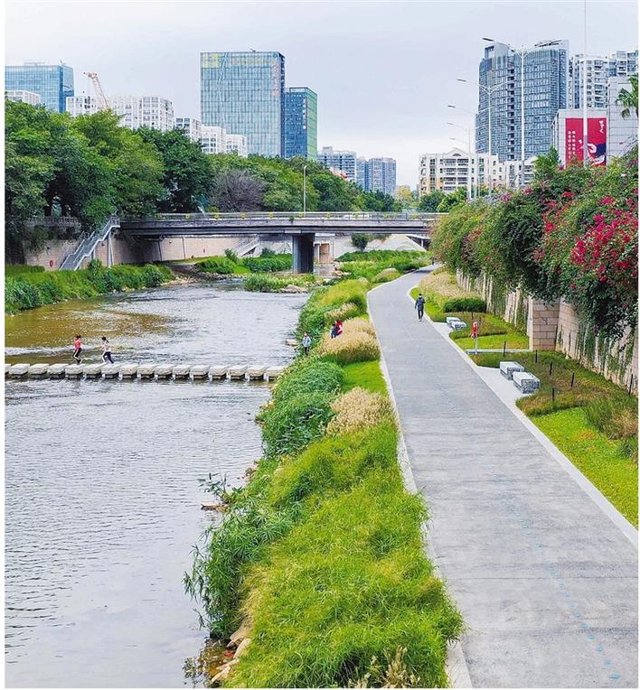 龙岗河干流碧道西起荷康路,东至龙岗区界,全长约20.77公里,是深圳市“千里碧道”建设的核心骨干项目,其中示范段起点位于吉祥南路桥,终点位于龙园福宁桥,全长约4.6公里,采取代建模式实施,于2021年10月开工建设。该碧道示范段项目以水安全为核心,以活力水脉、多元生境、客家文化为主题,通过生态塑造,在尊重本土文化特征的基础上,借助对原有场所的活化利用,重塑亲水文化,积极构建1+4+8”(1条庇护生息水脉、4大水岸成长家园、8个城市活力客厅)碧道总体空间。经过一年多的努力,U梦绿谷、宜居生活、龙园水岸等重要节点已建成开放,水岸共治、河畅景美、蓝天碧波、相映成趣的美丽画卷再现龙岗。