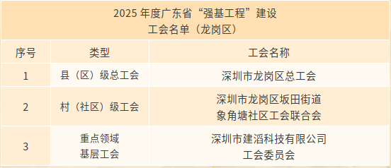 近日,广东省总工会公布了2025年度非公有制企业工会强基工程”建设项目认定名单,深圳市龙岗区总工会获评“2025年度广东省‘强基工程’建设县(区)级总工会”本次认定中深圳市共9家获认定,其中龙岗区有3家单位入选。