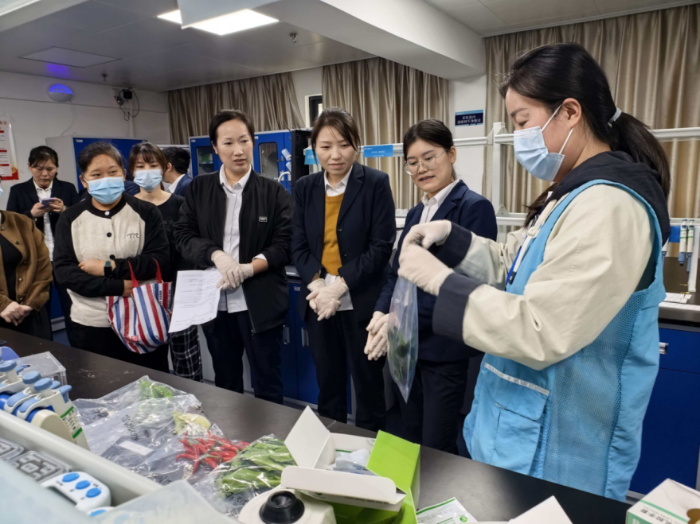 在快检操作区,专业检测员边操作边讲解,从取样、预处理到仪器分析,将“看不见”的检测过程一步步拆解展示,让居民对快检工作有了更具体的认识。