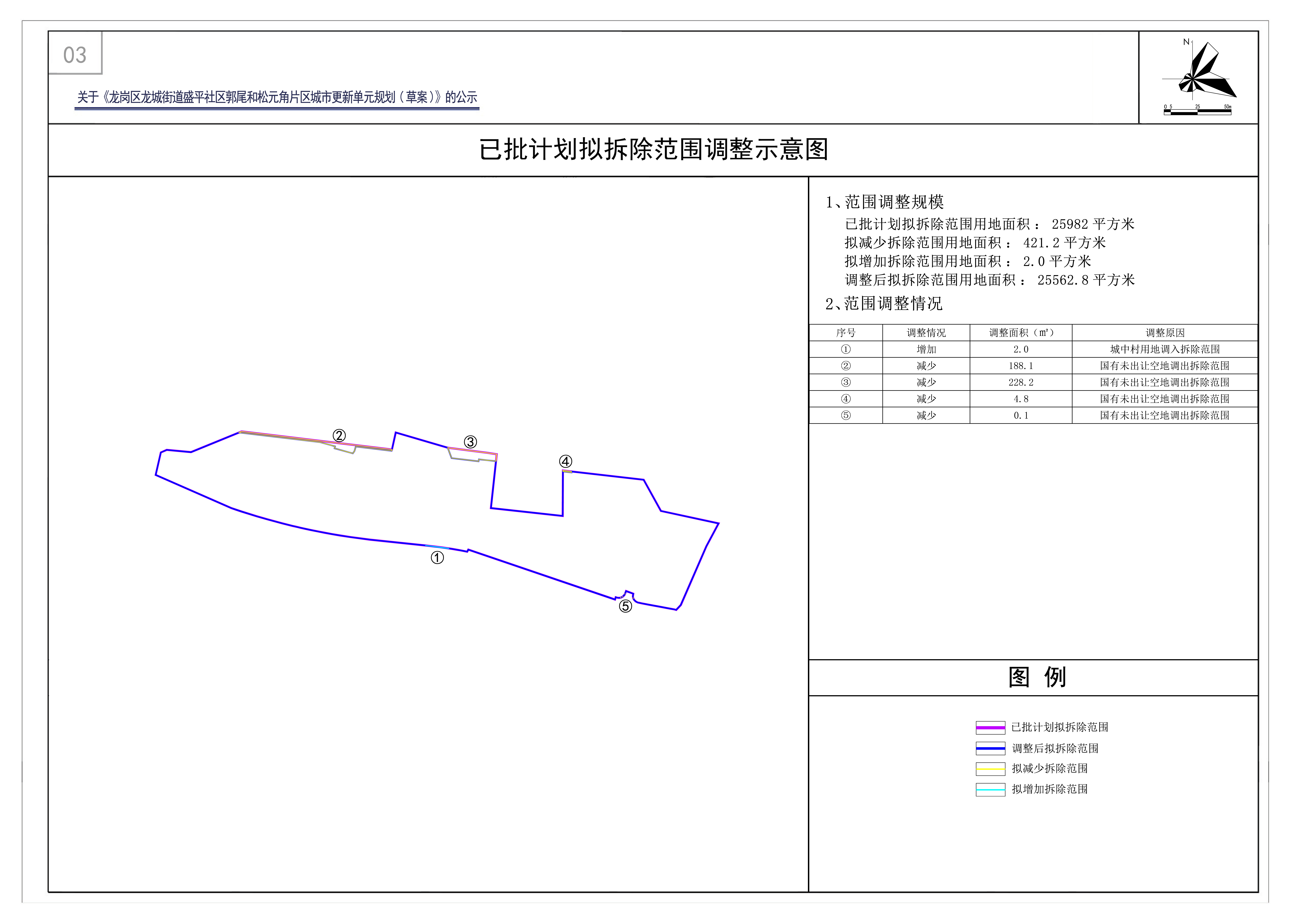 本次更新单元规划因剔除国有未出让用地空地等原因调整拆除范围,拆除范围用地面积由25892平方米调整为25562.8平方米。根据《深圳市拆除重建类城市更新单元规划审批规定》(深规划资源规﹝2020﹞2号)第十二条,该更新单元计划调整内容可与更新单元规划同步公示、同步申报审批。