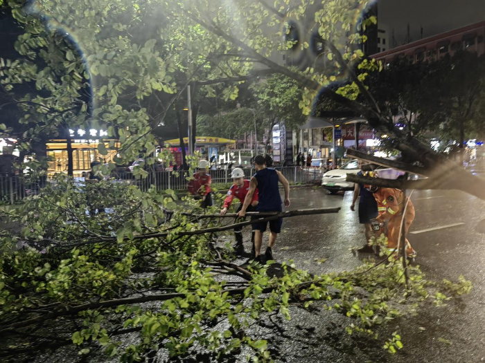 在平南学校路段,队员们又发现两棵倒伏树木,阻断了人行道与自行车道的通行。凭借丰富的应急处置经验,大家迅速集结、通力协作,合力将倒伏树木拖移至路边安全区域,及时消除行人与非机动车的通行障碍。